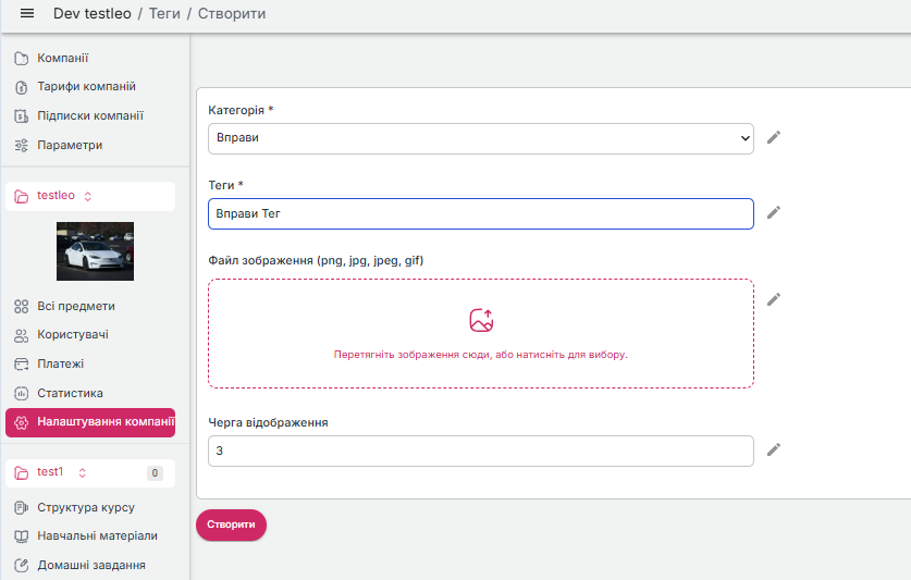 Щоб створити тег по вправам, нам потрібно перейти у розділ **"налаштування компанії"** та вибрати **"теги".** Натиснути "створити" і далі заповнити всі необхідні поля&#x20;