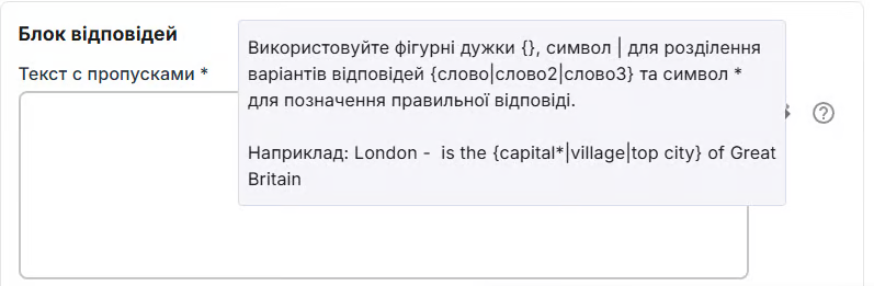 ✓ Використовуйте фігурні дужки {}, символ | для розділення варіантів відповідей {слово|слово2|слово3} та символ \* для позначення правильної відповіді.